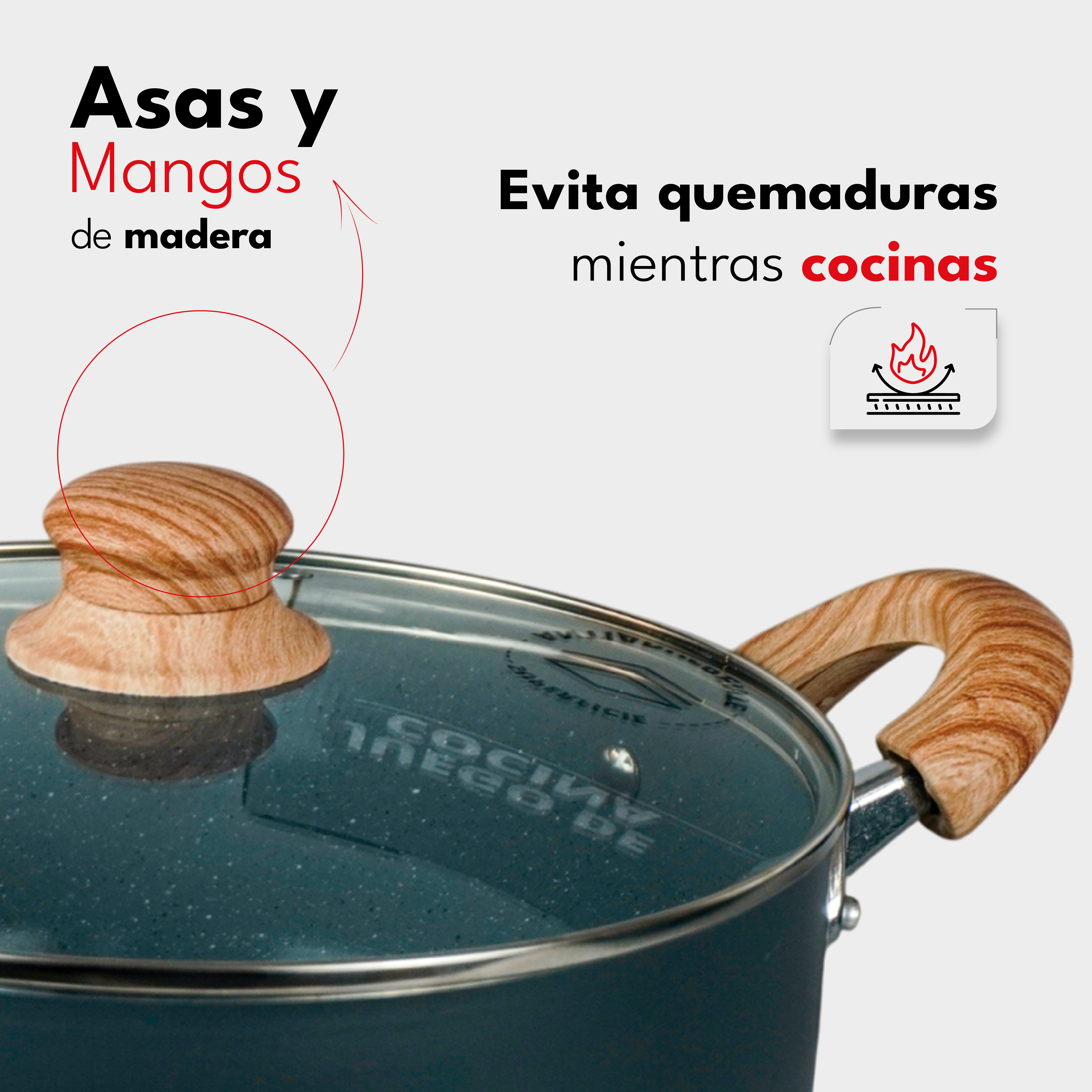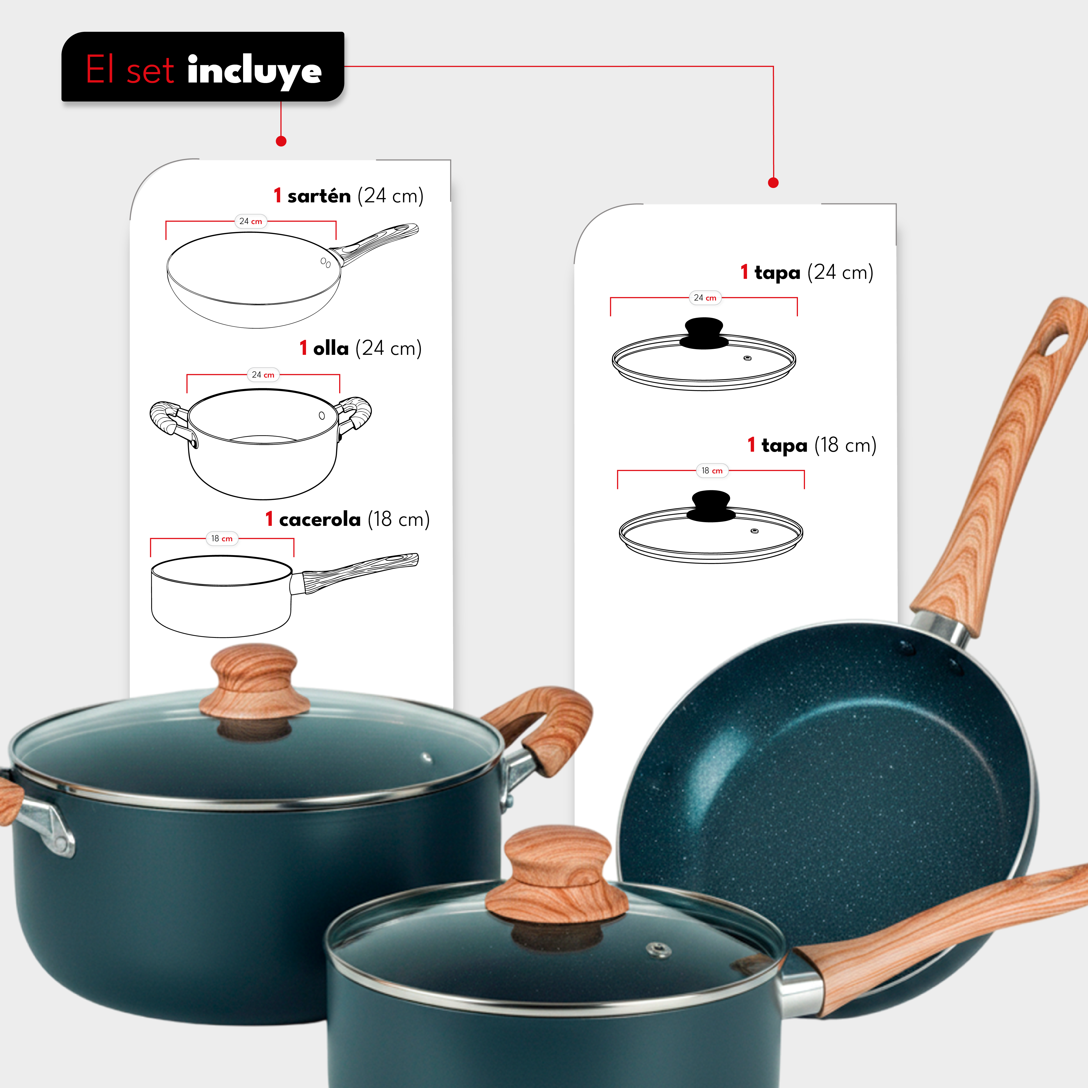 | Piezas incluidas | Cacerola 18 cm, Olla 24 cm, Sartén 24 cm, Tapa vidrio 18 cm, Tapa vidrio 24 cm |