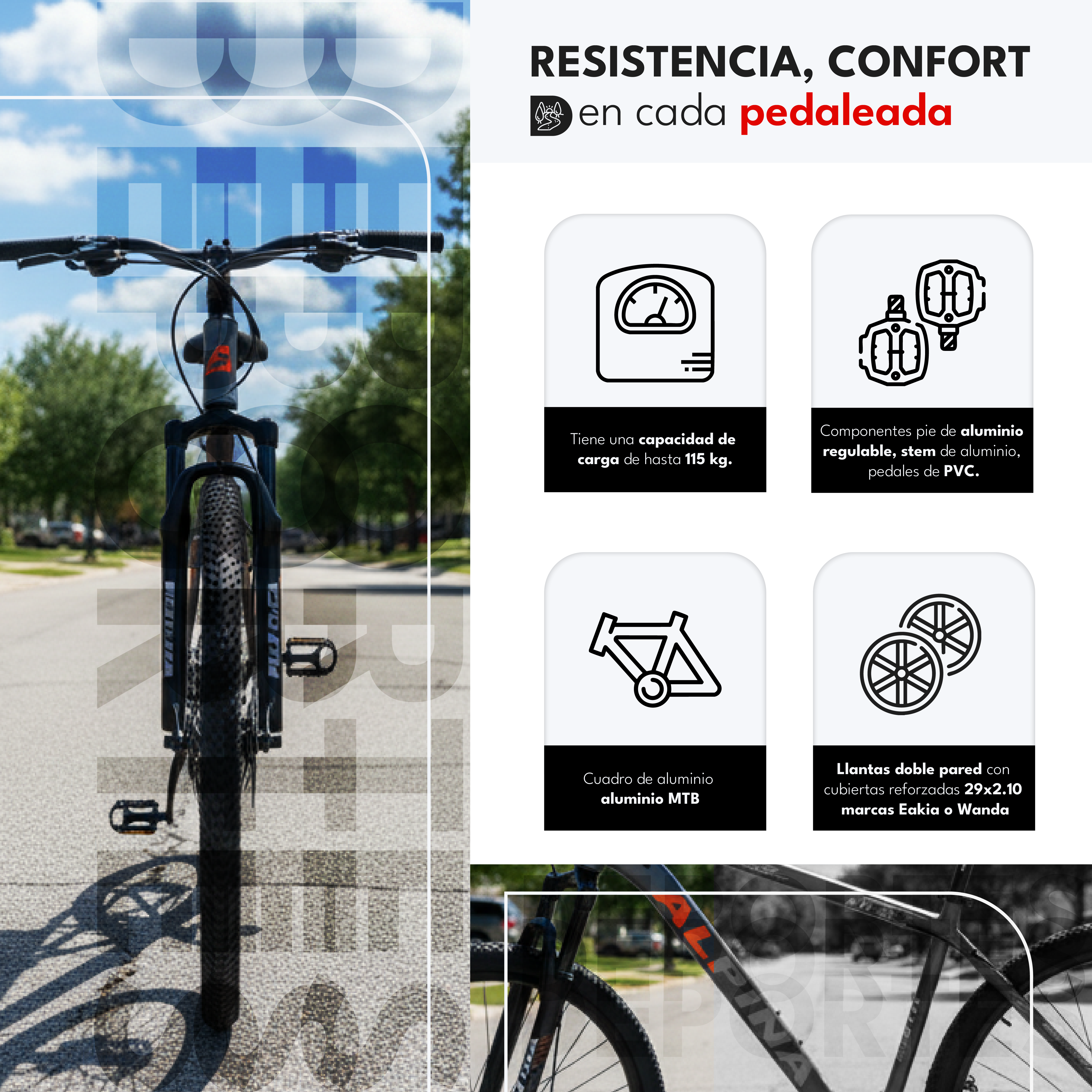 Equipada con llantas doble pared, cubiertas 29x2.10 y pedal de aluminio, está diseñada para brindarte estabilidad, agarre y durabilidad incluso en terrenos irregulares. Además, incluye pie de apoyo regulable y un diseño moderno que no pasa desapercibido.