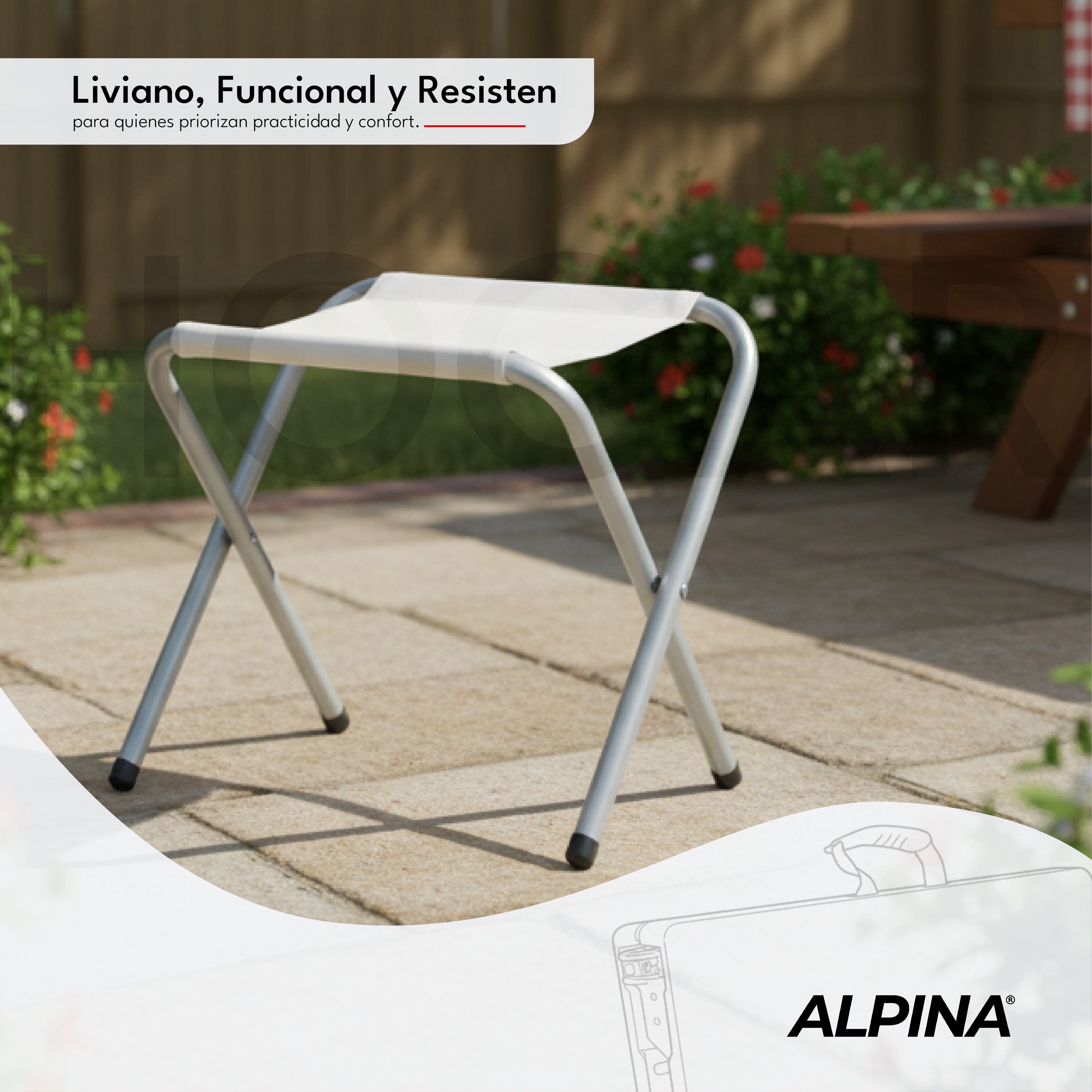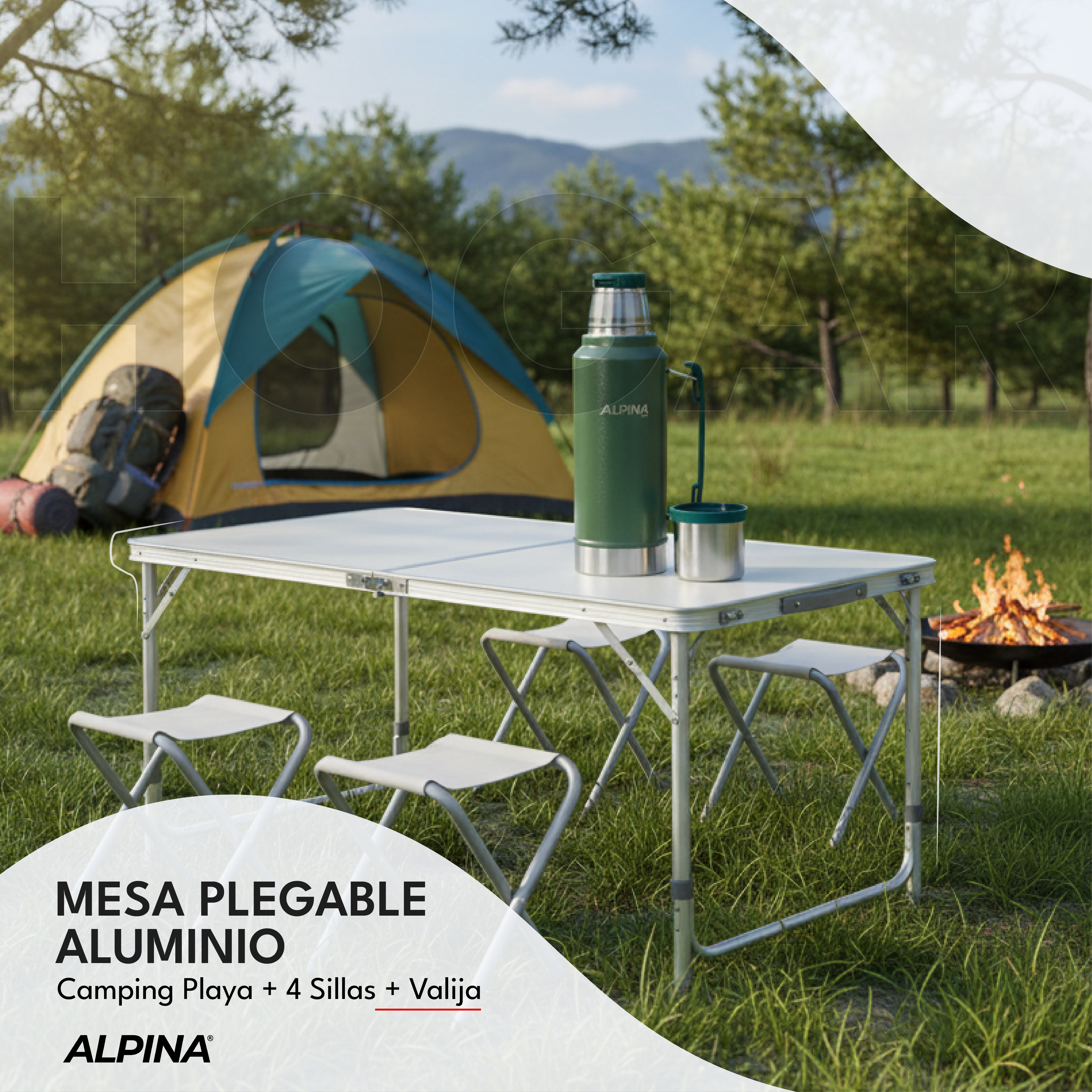 El Set Alpina Camping-01 es la solución todo-en-uno para tus salidas al aire libre. Incluye una mesa plegable de aluminio con tres niveles de altura y 4 sillas livianas también plegables, todo en una valija compacta y fácil de transportar. Ideal para usar en camping, playa, picnics o jardín.