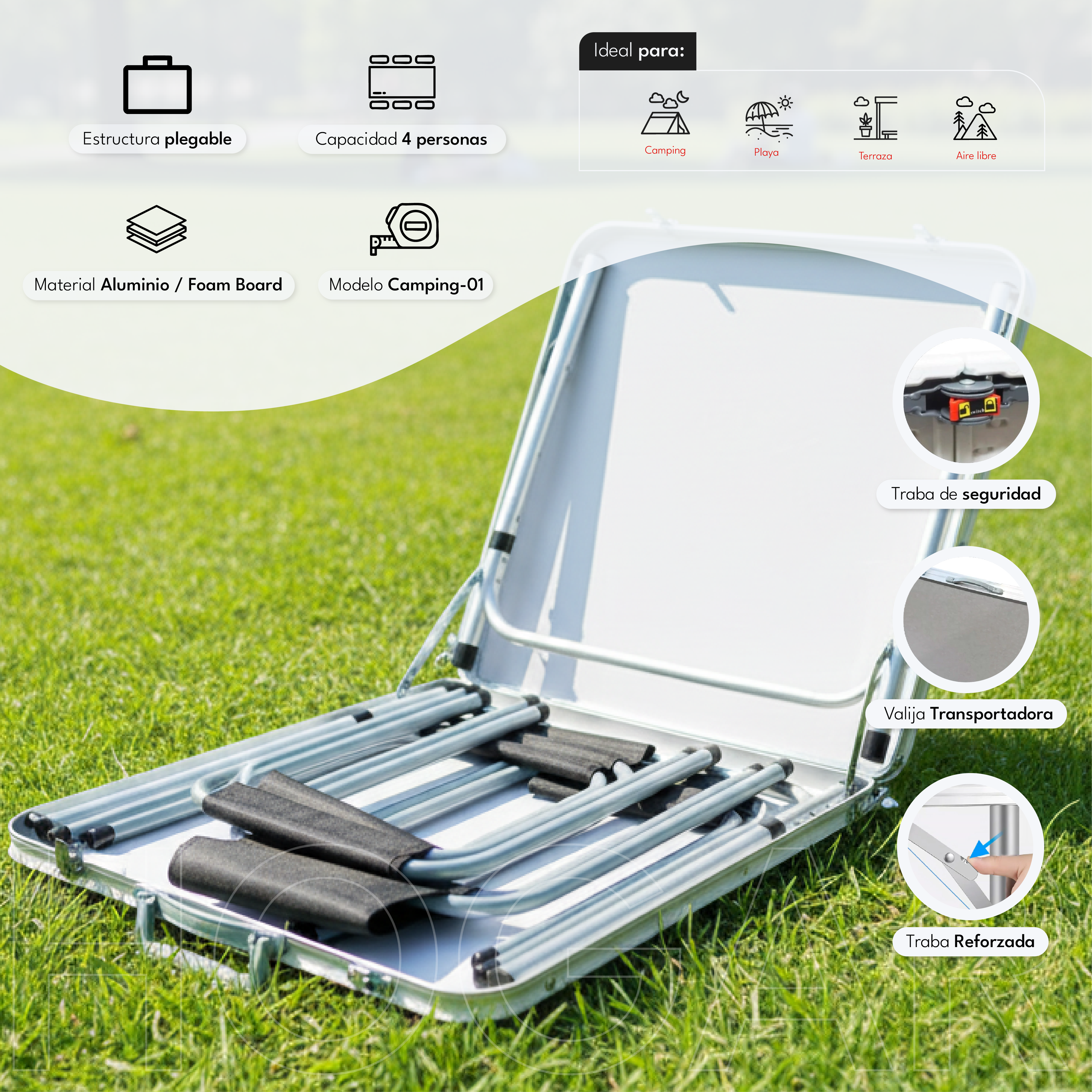 El conjunto está fabricado con estructura de aluminio resistente y superficie de foam board, ofreciendo estabilidad y bajo peso. Su sistema de cierre seguro y manija incorporada hacen que sea cómodo de trasladar y guardar.