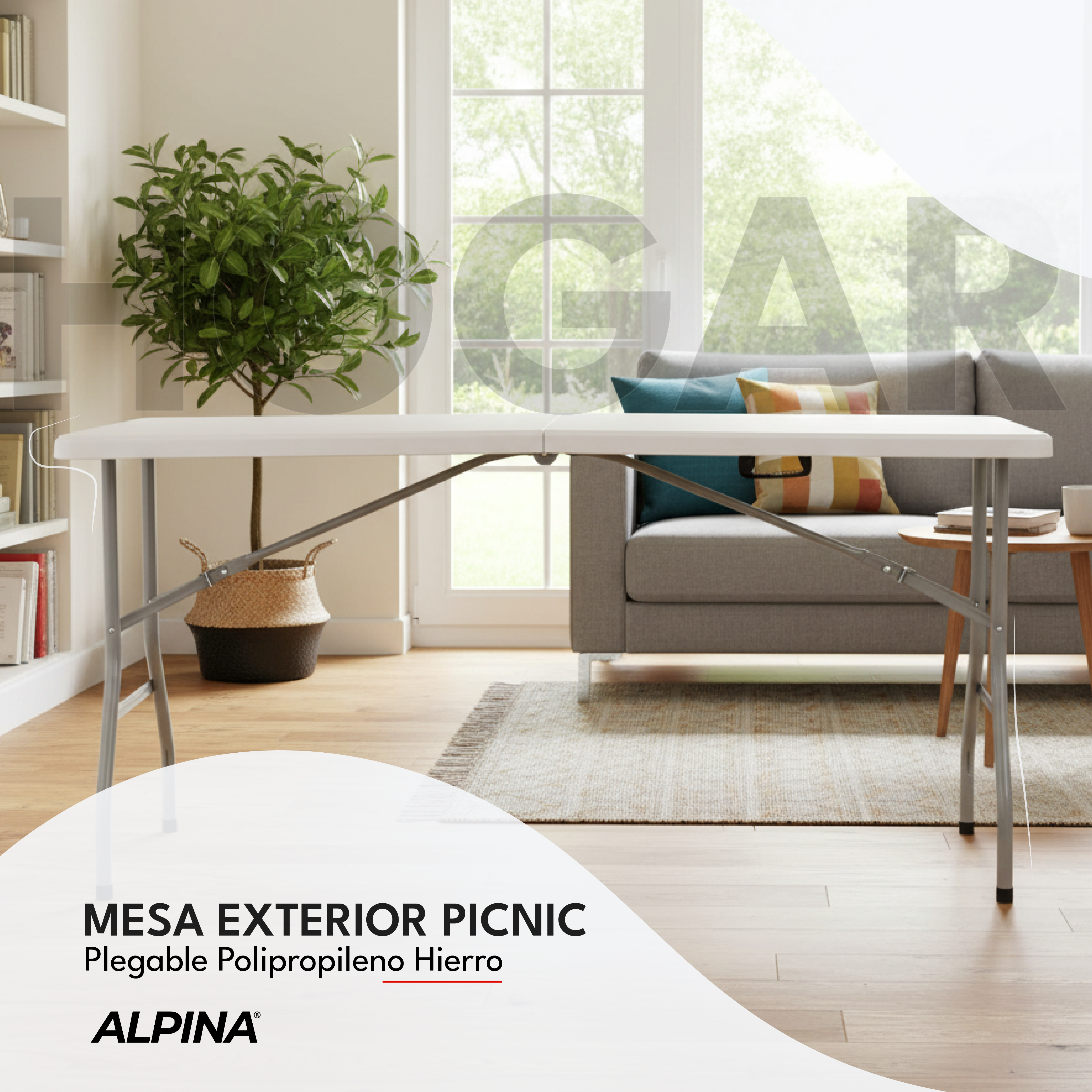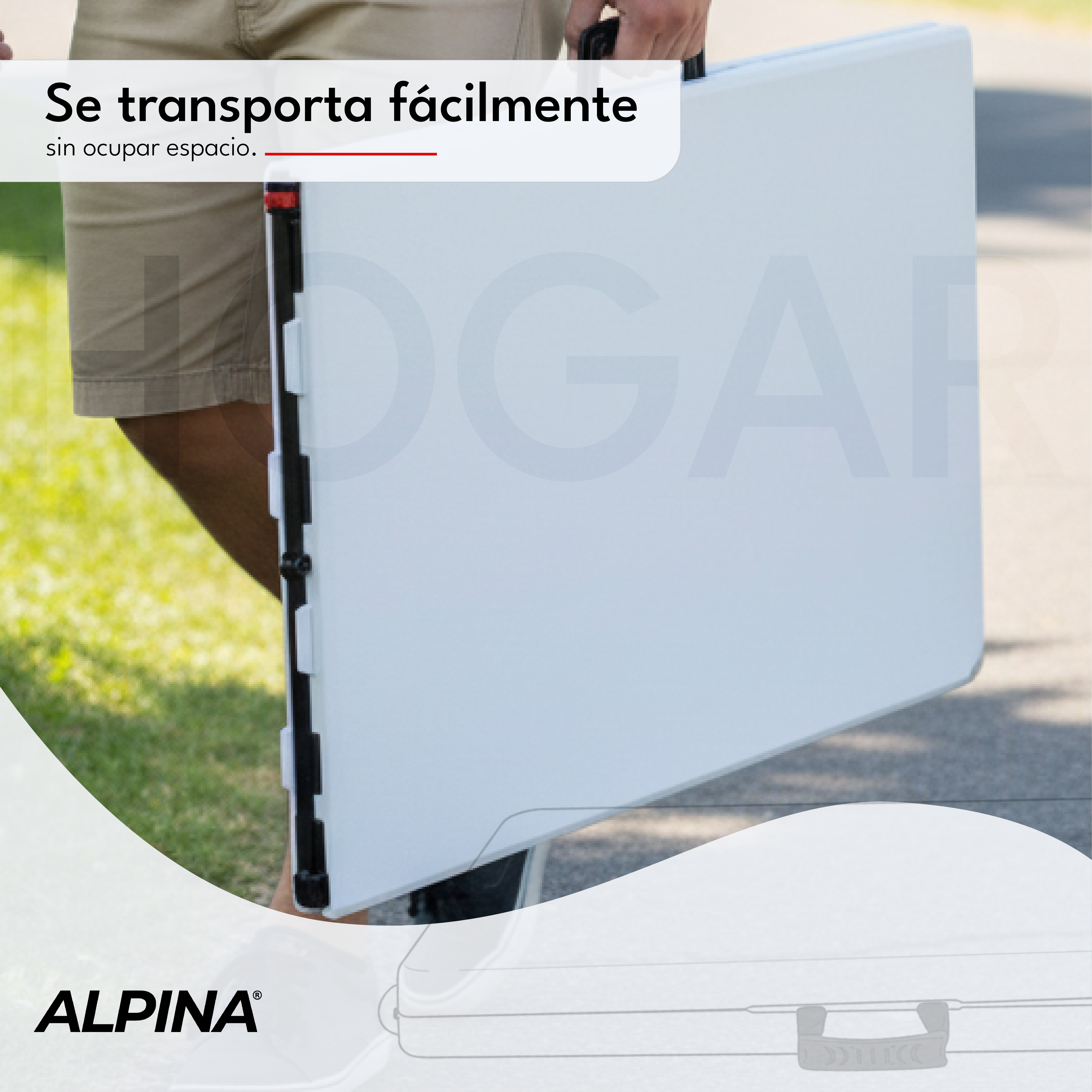 La Mesa Plegable Alpina de 1,52 metros es una opción práctica, resistente y portátil para quienes buscan una superficie funcional tanto en interiores como al aire libre. Su diseño plegable con formato maletín permite transportarla fácilmente y guardarla sin ocupar espacio.