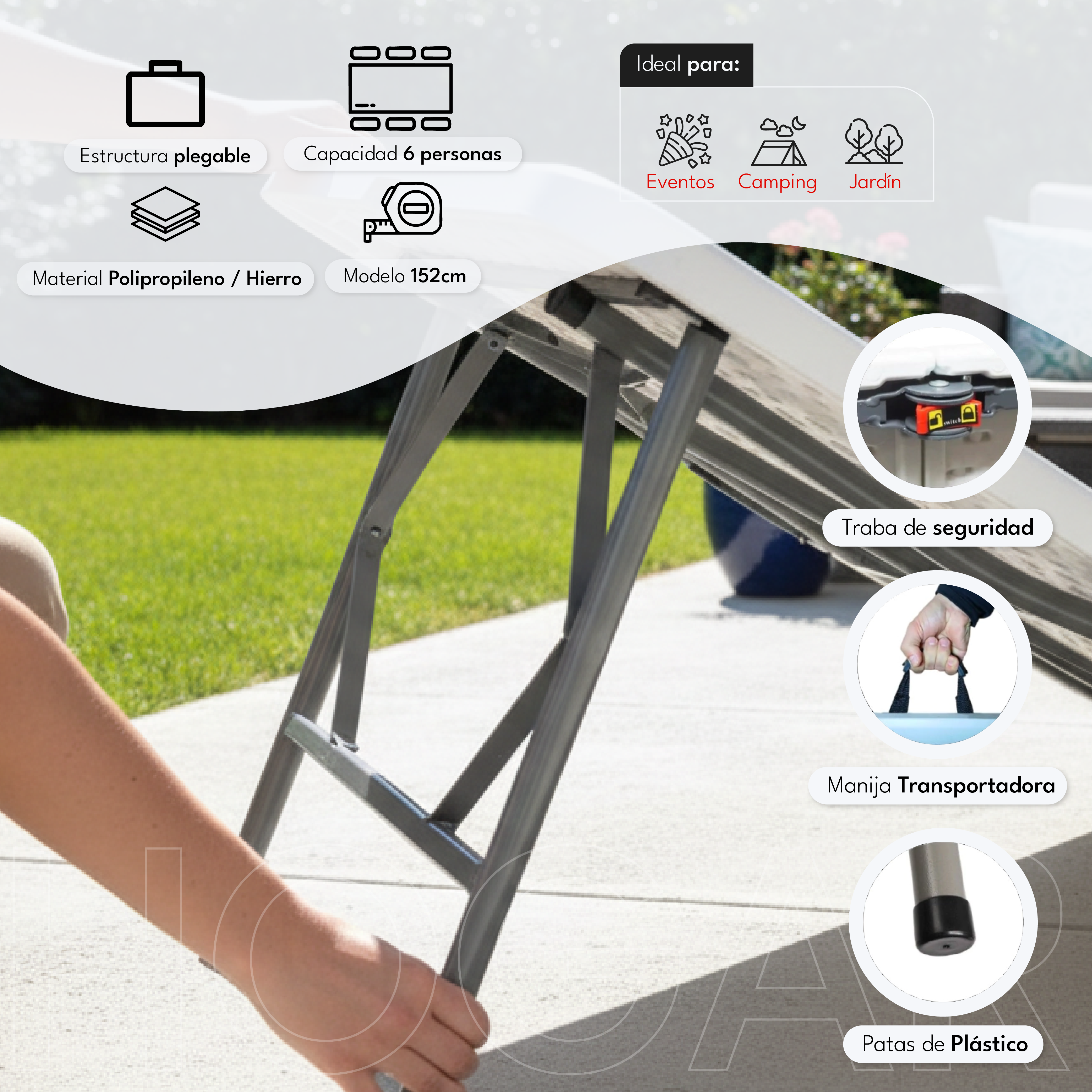 Con una estructura sólida de patas de hierro y superficie de polipropileno, está pensada para ofrecer estabilidad y durabilidad, ideal para picnics, camping, ferias o eventos familiares.