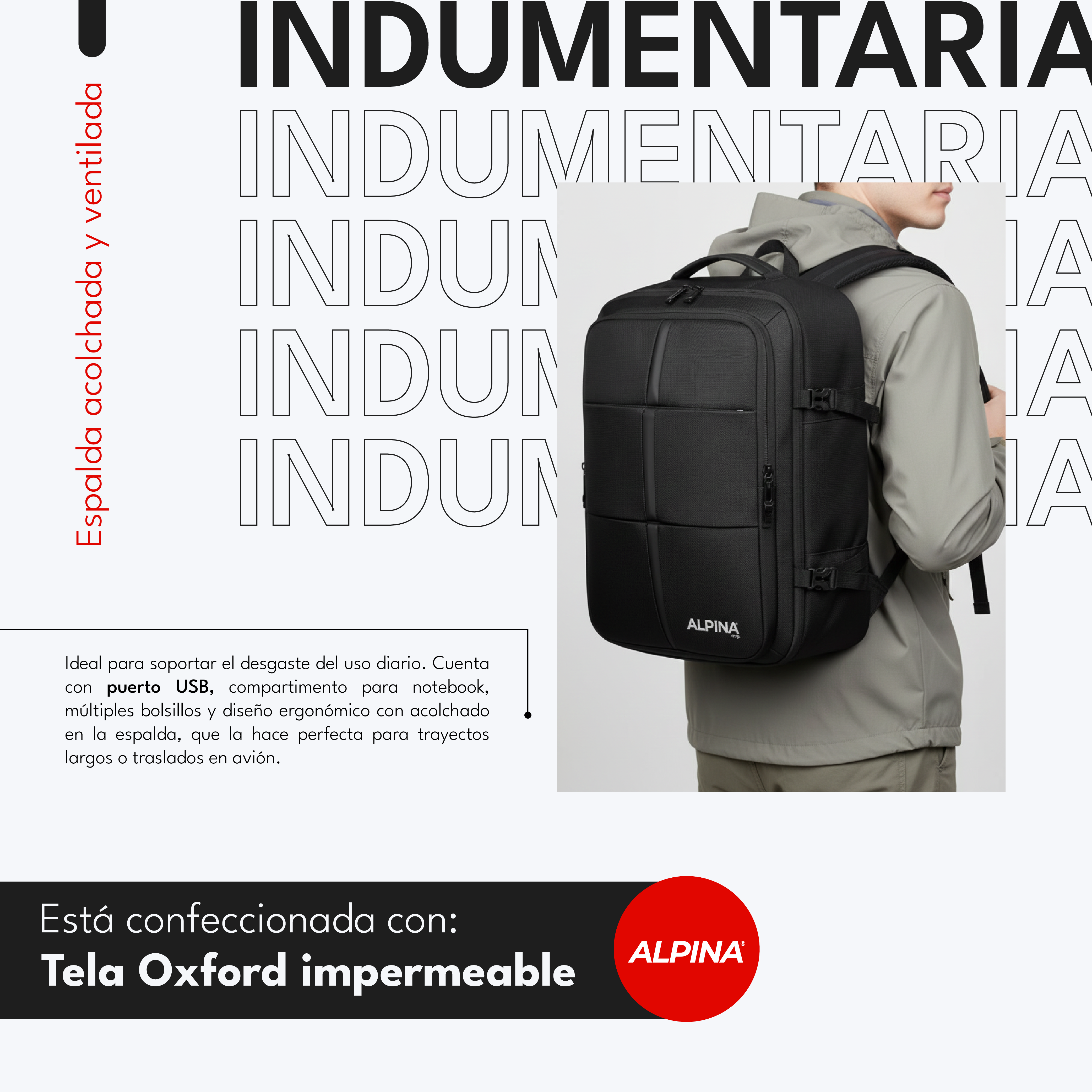 Está confeccionada con tela Oxford impermeable y reforzada, ideal para soportar el desgaste del uso diario. Cuenta con puerto USB, compartimento para notebook, múltiples bolsillos y diseño ergonómico con acolchado en la espalda, que la hace perfecta para trayectos largos o traslados en avión.