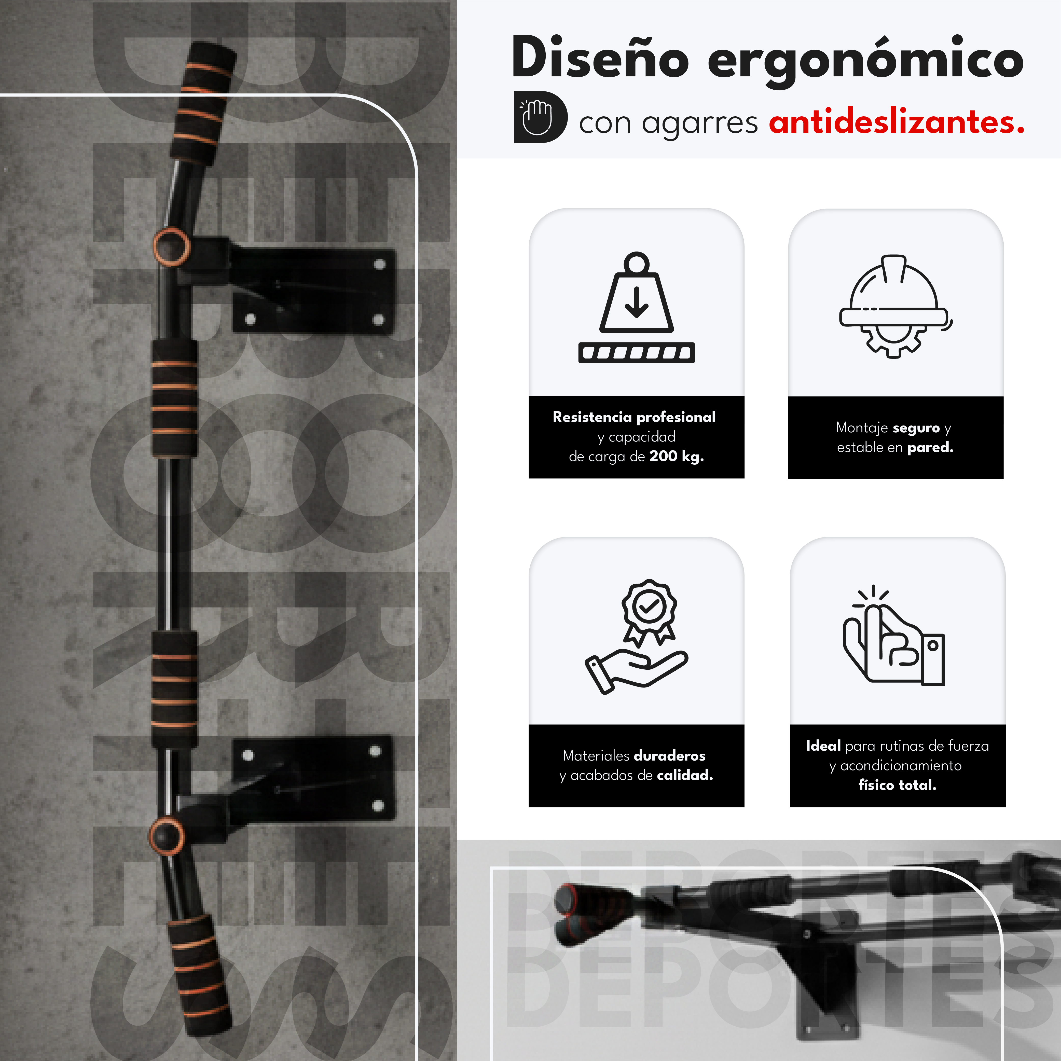 Su diseño profesional con mangos antideslizantes de espuma de alta densidad garantiza un agarre firme y cómodo, evitando resbalones y reduciendo la fatiga durante el uso. Incluye además un kit completo de montaje con tornillos y anclajes de fijación, para una instalación rápida y segura en cualquier pared sólida.