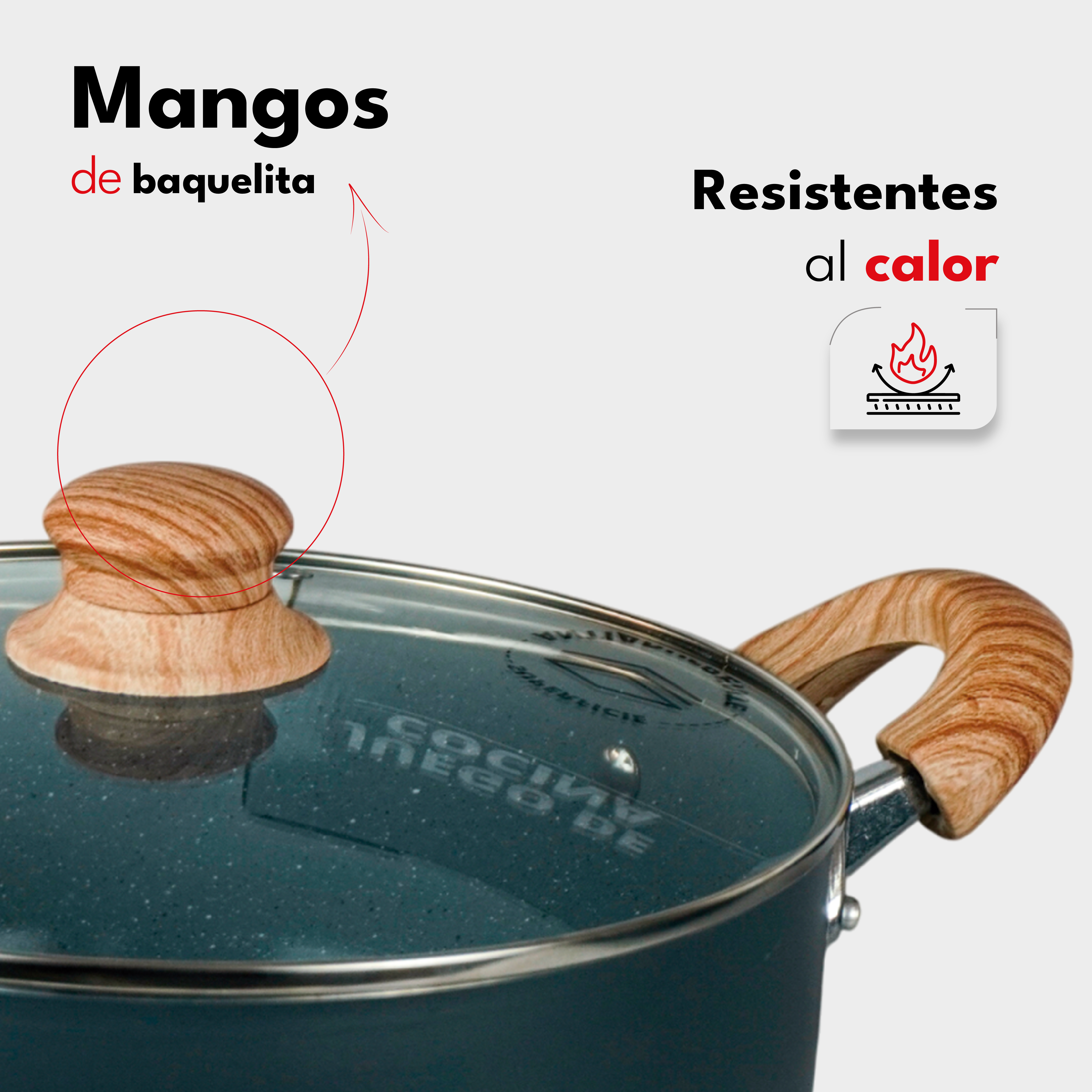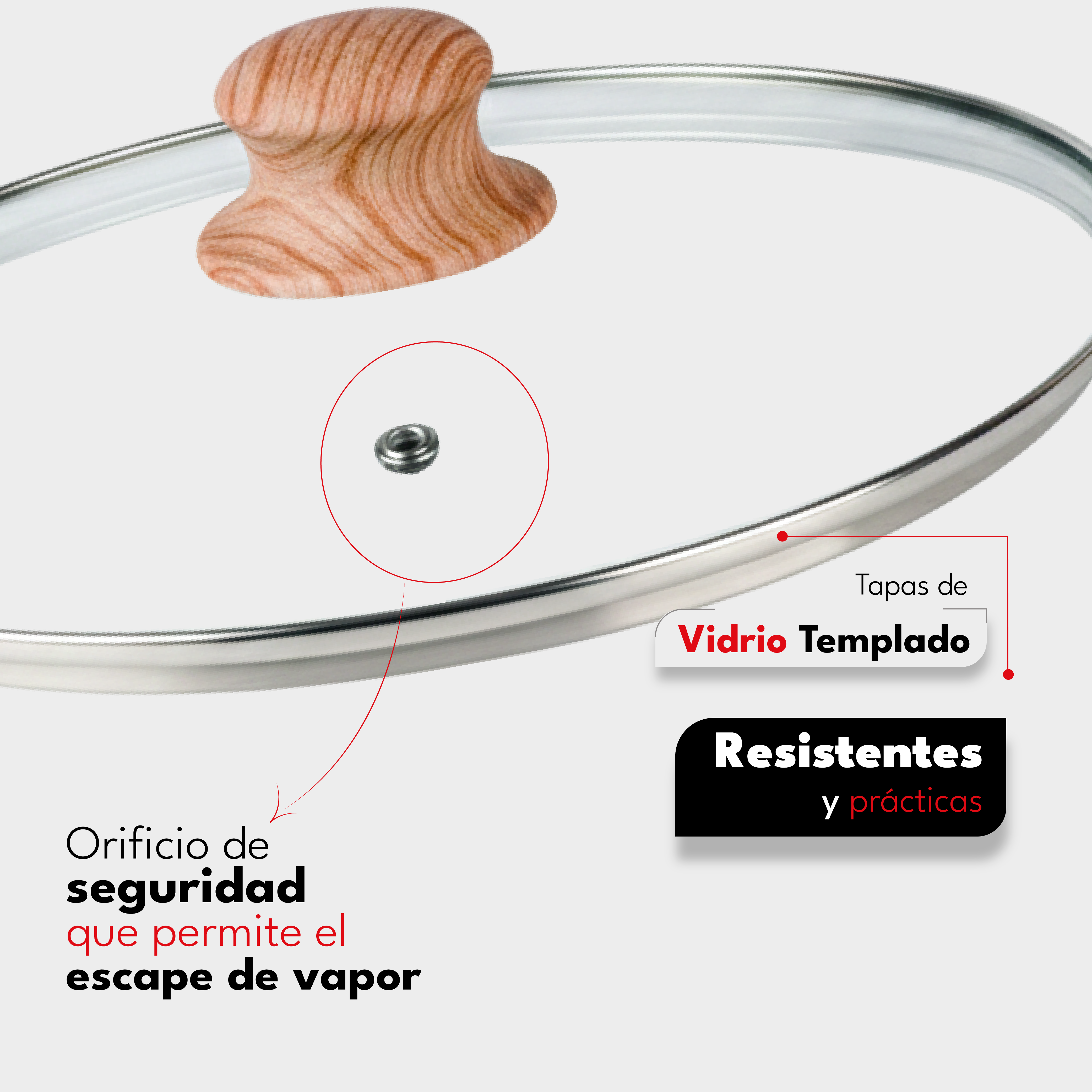 | Materiales | Aluminio 3003, acero inoxidable inductivo 430 de 2 mm, cerámica Maifan, baquelita, vidrio templado |