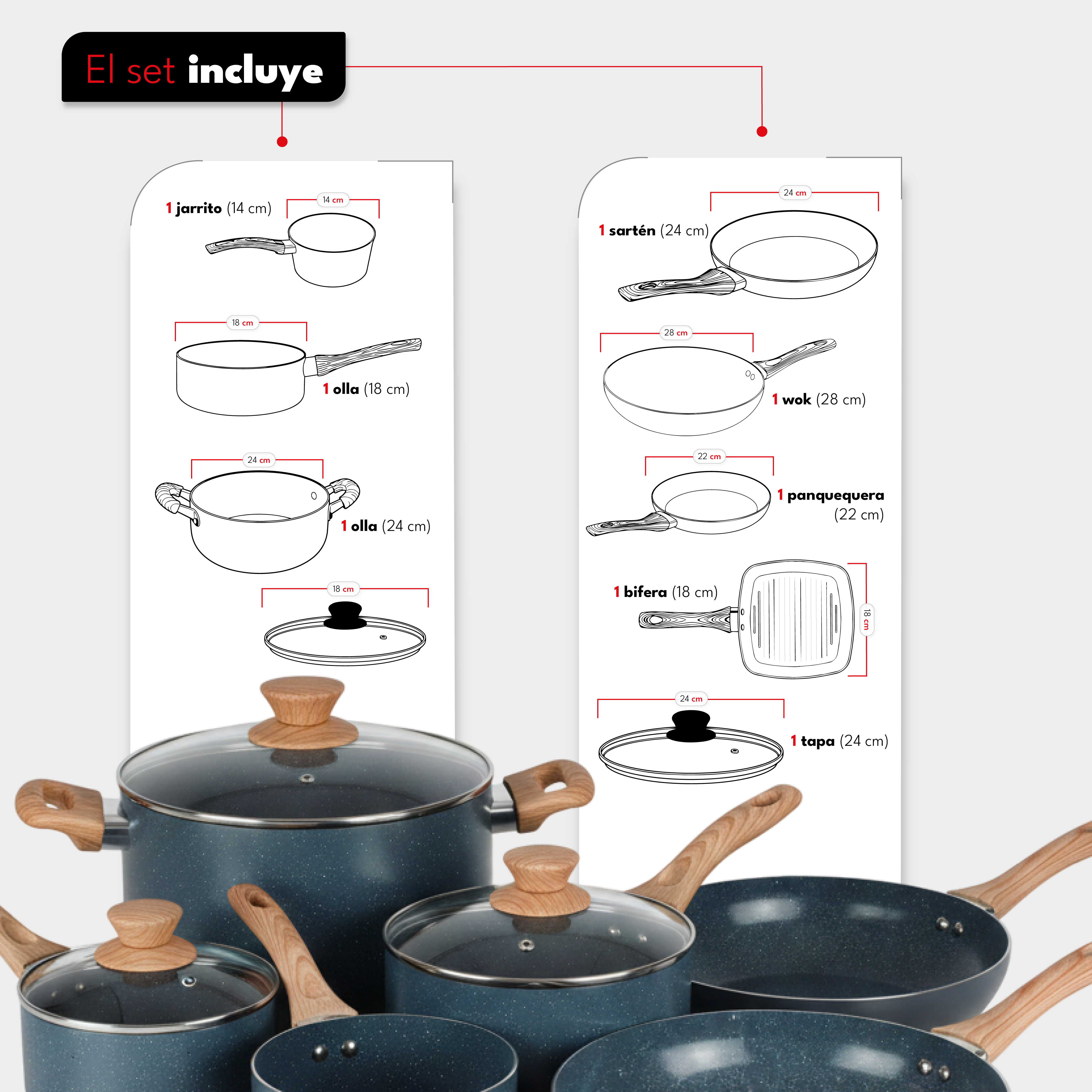 | Incluye | Jarrito, ollas, sartén, wok, panquequera, bifera, tapas de vidrio |