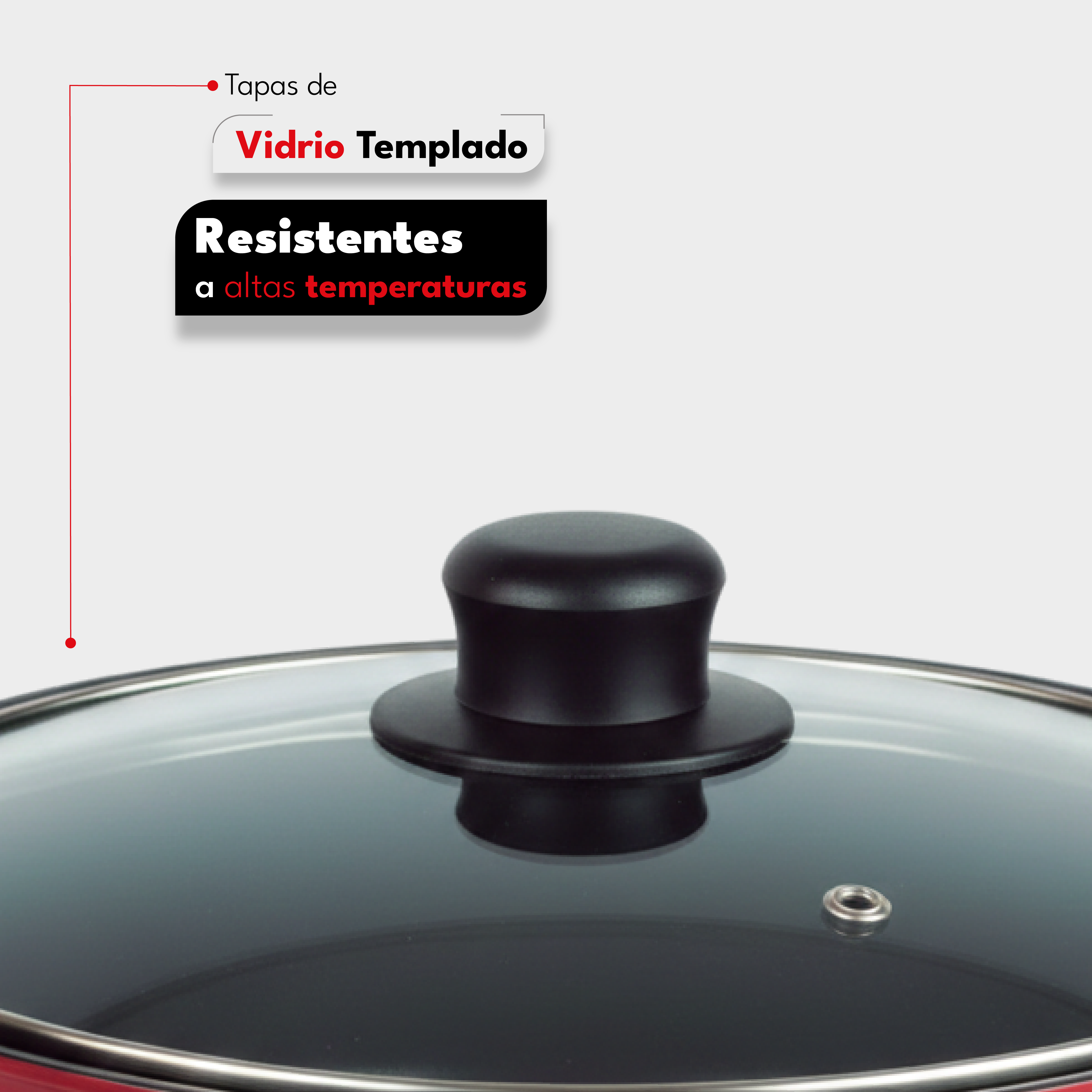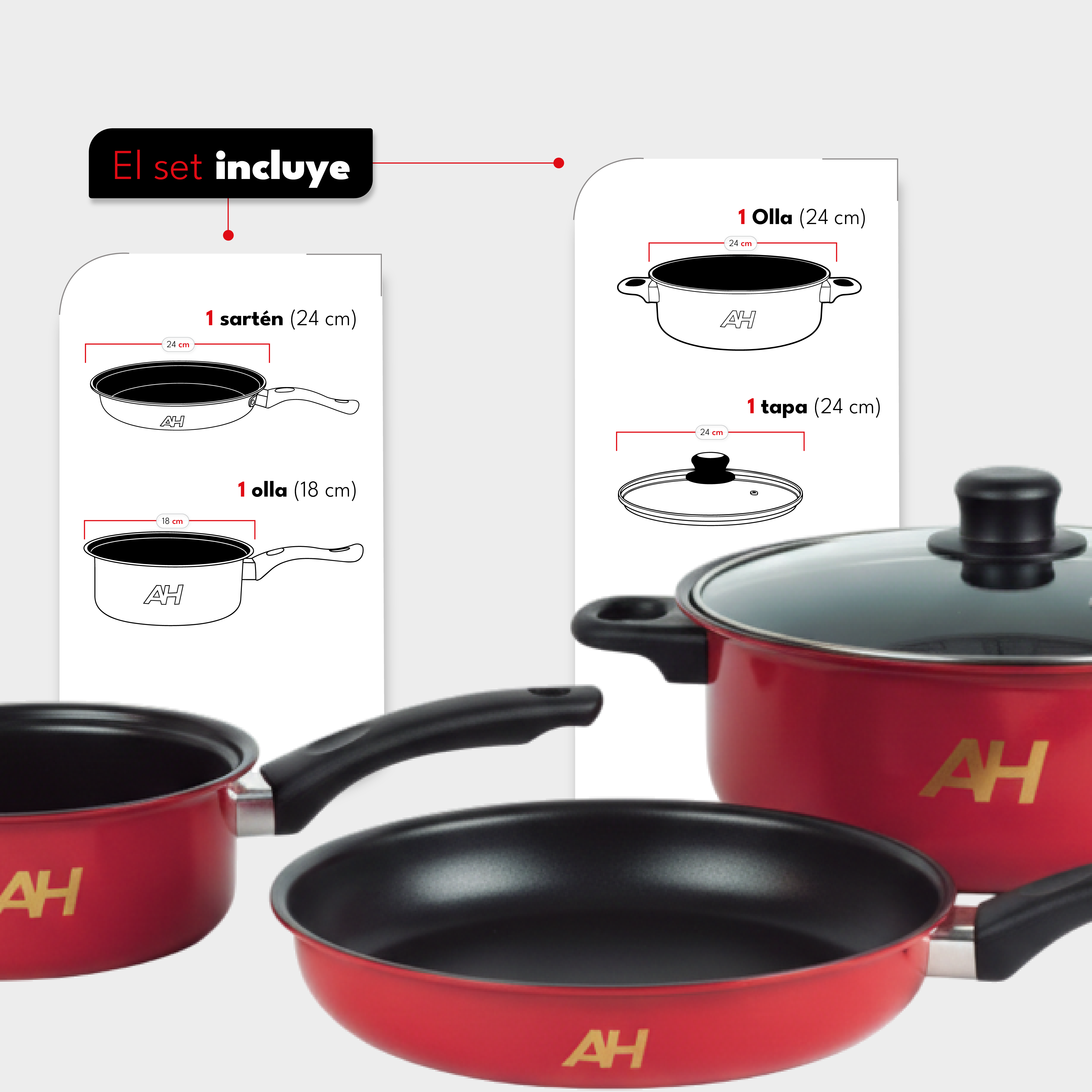 | Incluye | 1 Sartén 24 cm, 1 Olla 18 cm, 1 Olla 24 cm, 1 tapa vidrio templado 24 cm |