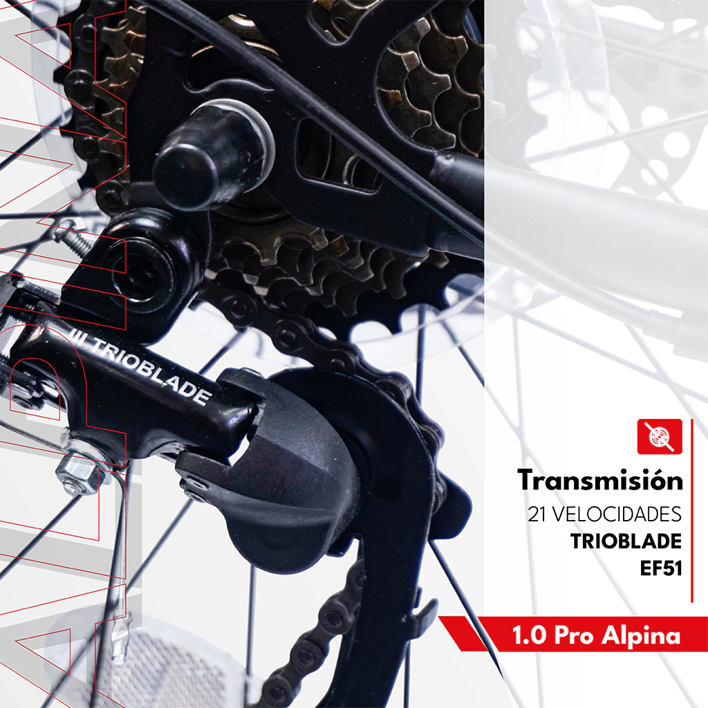 Equipada con una transmisión de 21 velocidades TRIOBLADE EF51, permite ajustar el nivel de esfuerzo y velocidad con total precisión, adaptándose tanto a subidas exigentes como a trayectos urbanos. Los frenos a disco mecánicos delanteros y traseros aseguran una respuesta rápida y confiable bajo cualquier condición climática.