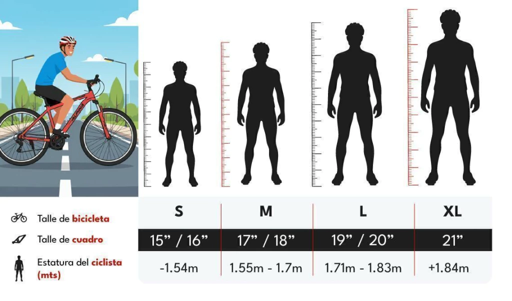 Equipada con 21 velocidades Shimano, horquilla con suspensión regulable y frenos a disco mecánicos, brinda un pedaleo seguro, fluido y adaptable a distintos terrenos. Su rodado 29 con llantas doble pared y cubiertas 29x2.10 refuerza la estabilidad y el agarre en caminos urbanos y de montaña. Con apenas 15 kg, se convierte en una bicicleta ágil y resistente, ideal para quienes buscan superar sus límites.