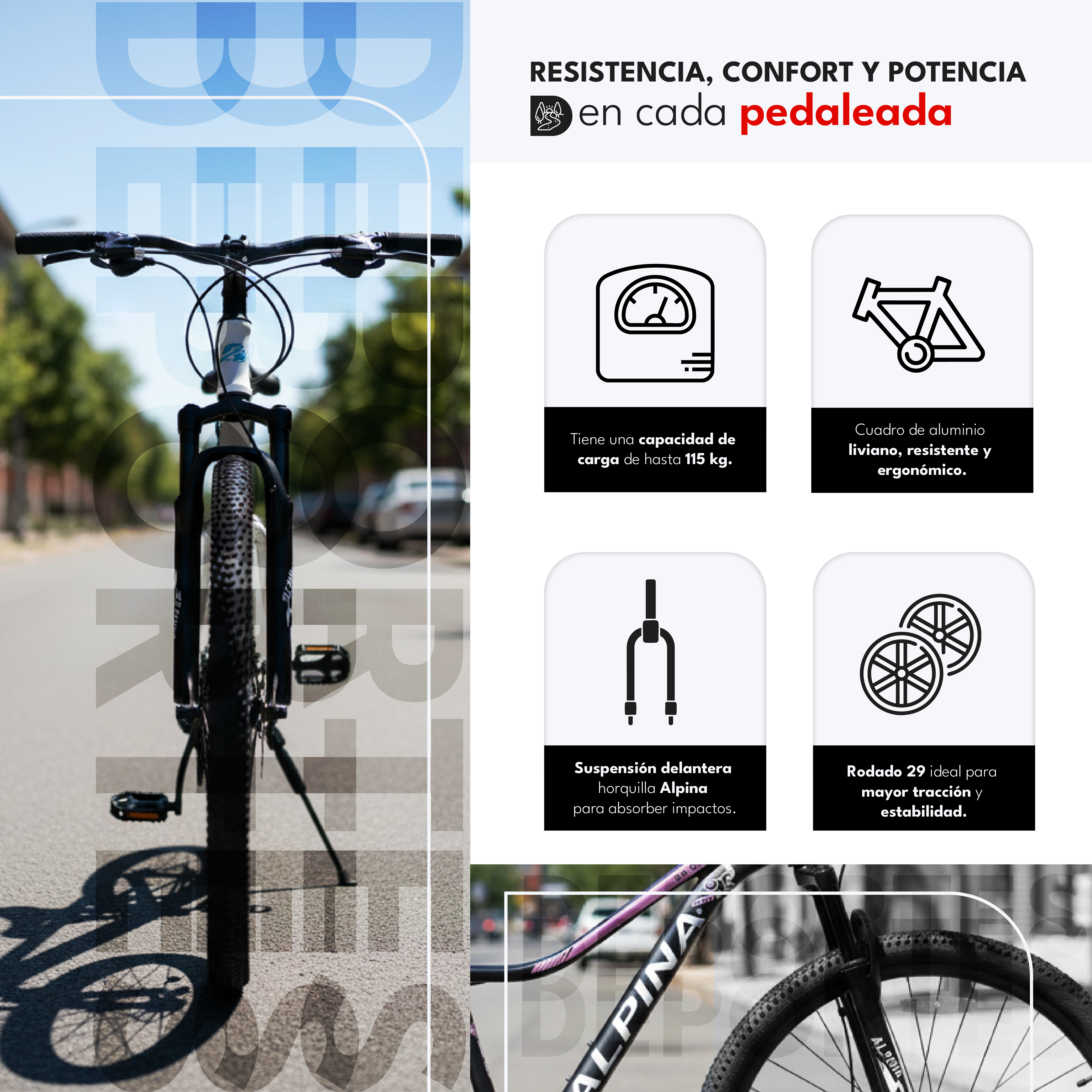 Superá tus límites con la Alpina 3.0 Pro Lady, una bicicleta de montaña con cuadro de aluminio, transmisión Shimano de 21 velocidades y rodado 29. Diseñada para ofrecer resistencia, confort y potencia en cada pedaleada, es ideal para entrenamientos, paseos y aventuras al aire libre.