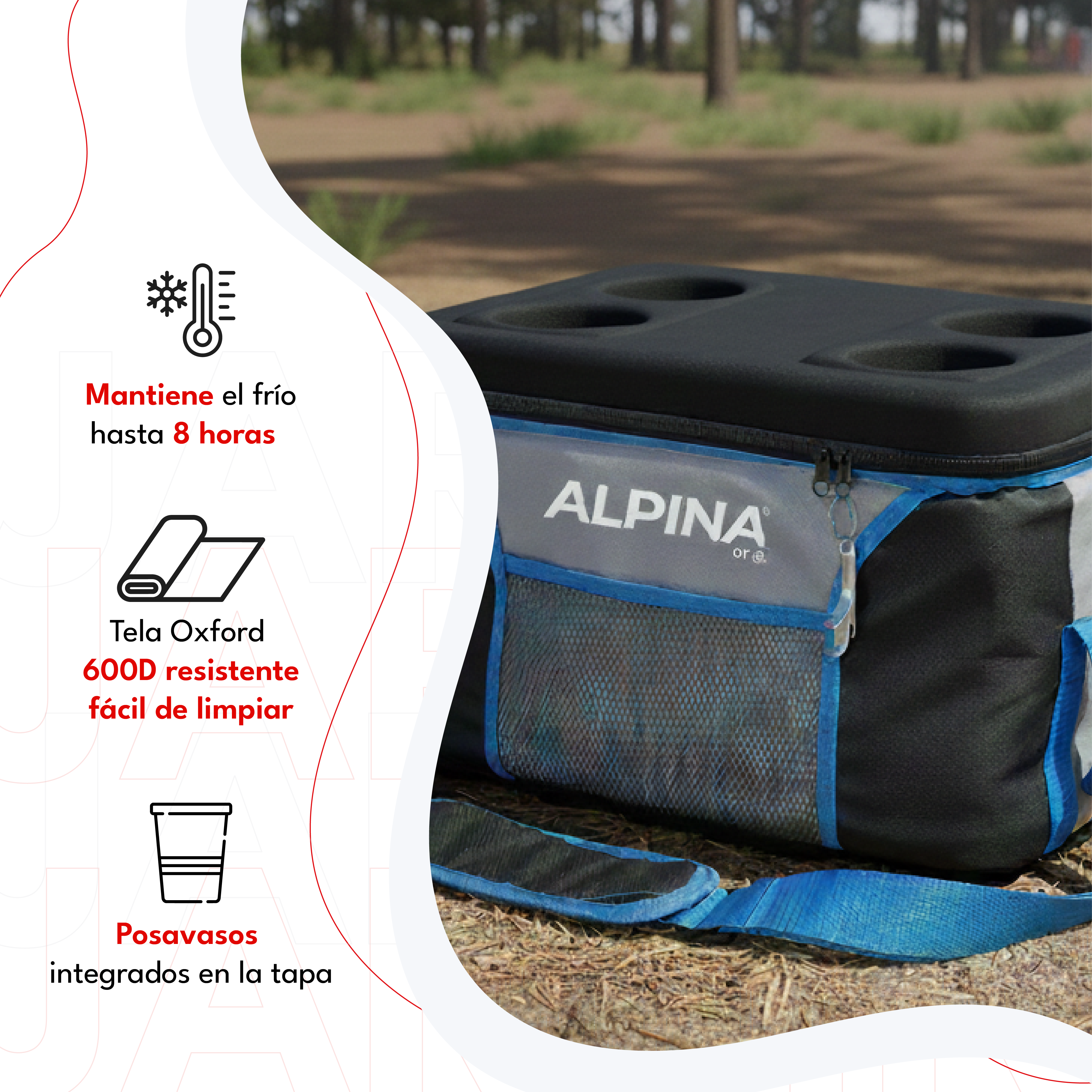 Fabricado en tela Oxford 600D de alta resistencia con forro interno de PEVA de 8 mm, ofrece durabilidad, fácil limpieza y excelente conservación del frío. Incluye manija, correa ajustable, bolsillos laterales, posavasos integrados en la tapa y abridor de botellas para una experiencia más práctica.