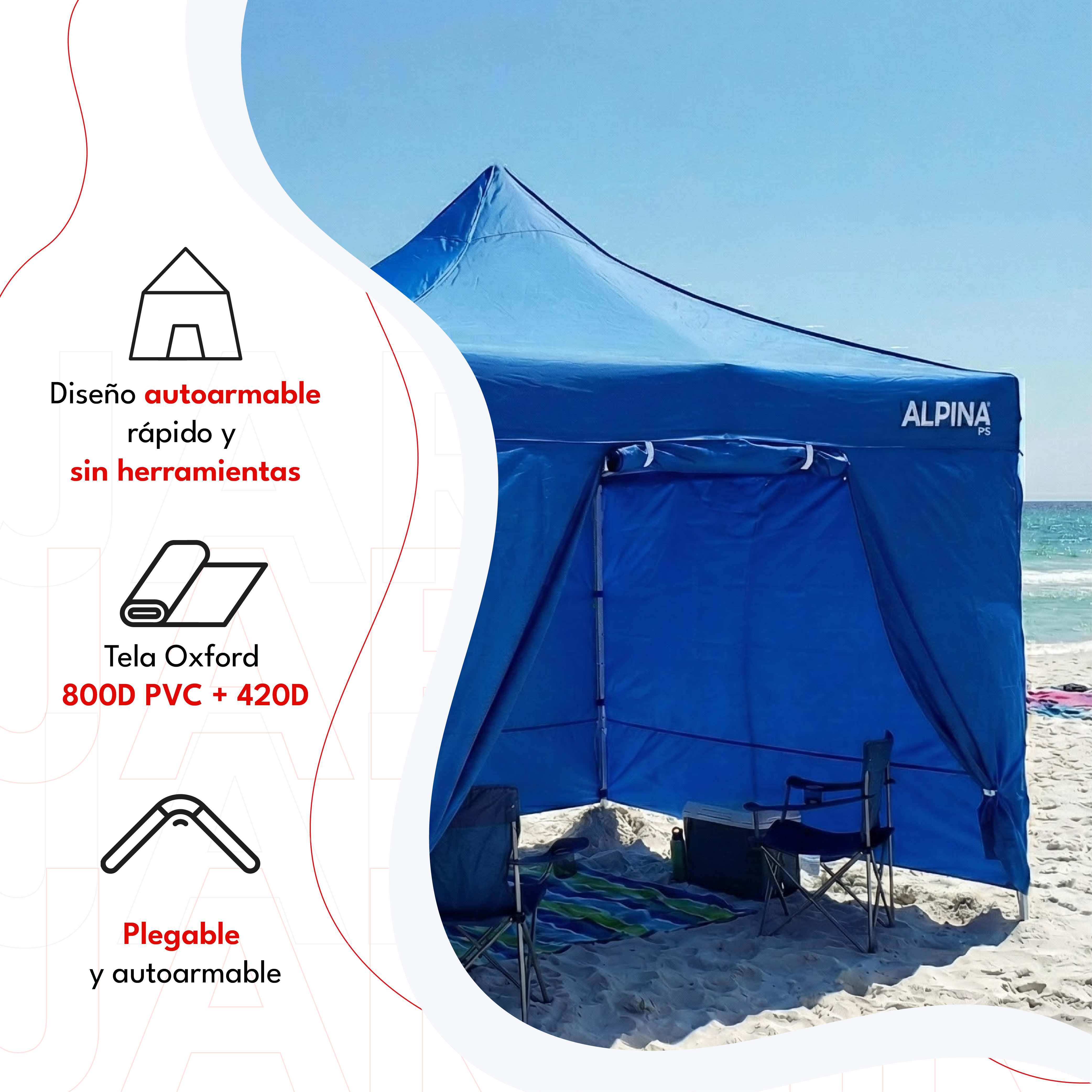 El Gazebo Alpina Forti Beach está diseñado para ofrecer máxima protección, firmeza y durabilidad en todo tipo de eventos al aire libre. Ideal para playa, ferias, camping o uso profesional, combina una estructura reforzada de acero con materiales premium que aseguran una cobertura confiable frente al sol, la lluvia o el viento.