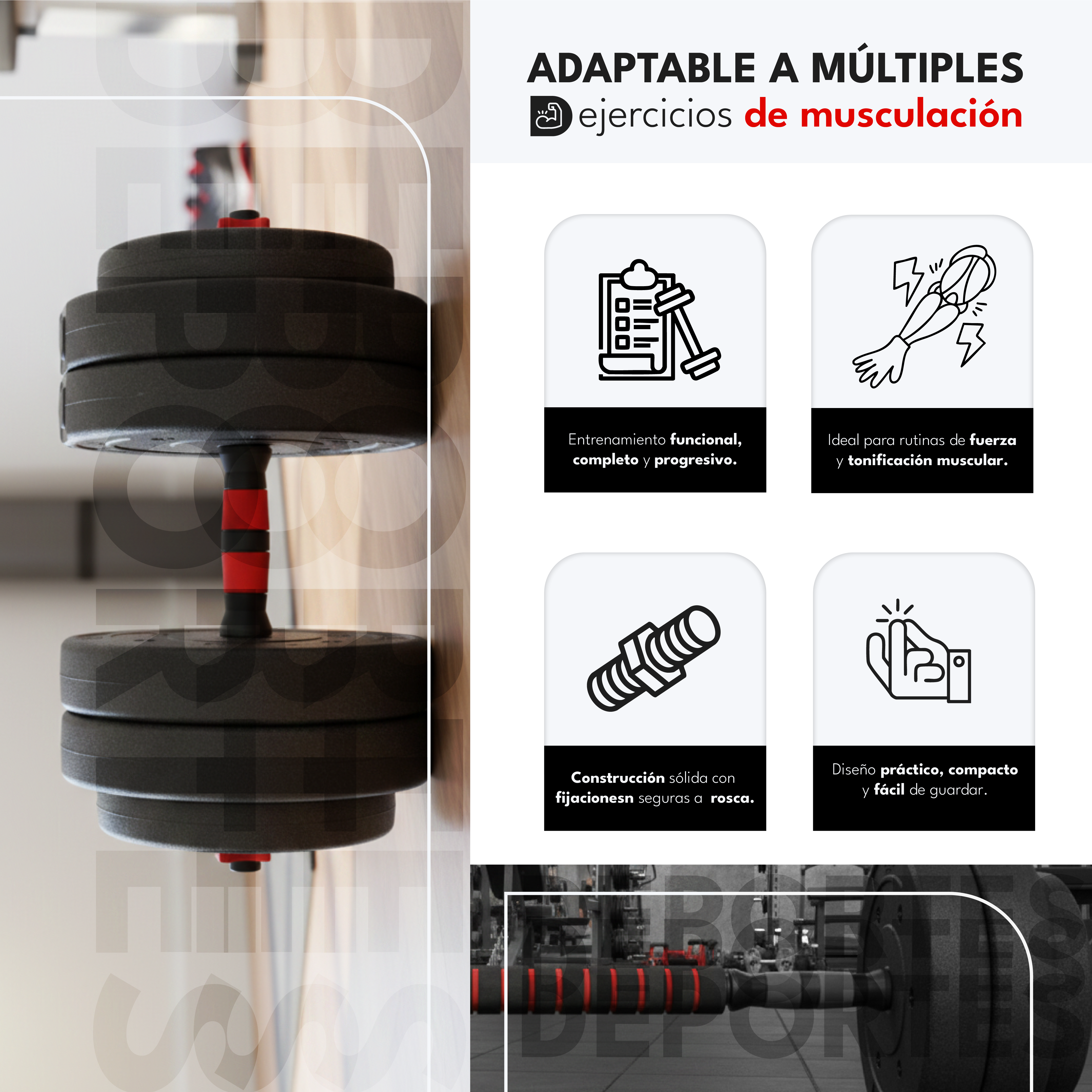 - Versatilidad 2 en 1: mancuernas + barra de levantamiento.