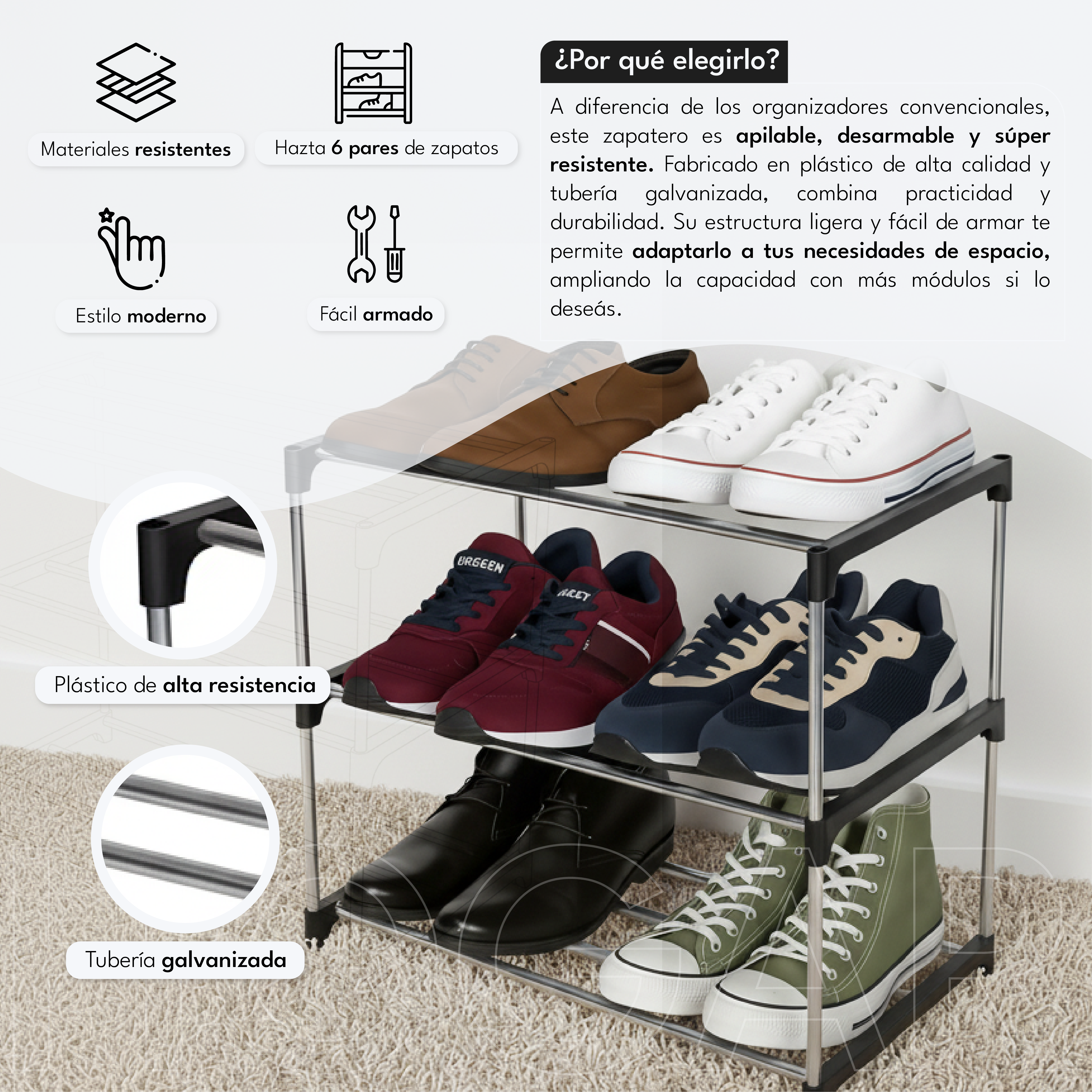 A diferencia de los organizadores convencionales, este zapatero es apilable, desarmable y súper resistente. Fabricado en plástico de alta calidad y tubería galvanizada, combina practicidad y durabilidad. Su estructura ligera y fácil de armar te permite adaptarlo a tus necesidades de espacio, ampliando la capacidad con más módulos si lo deseás.