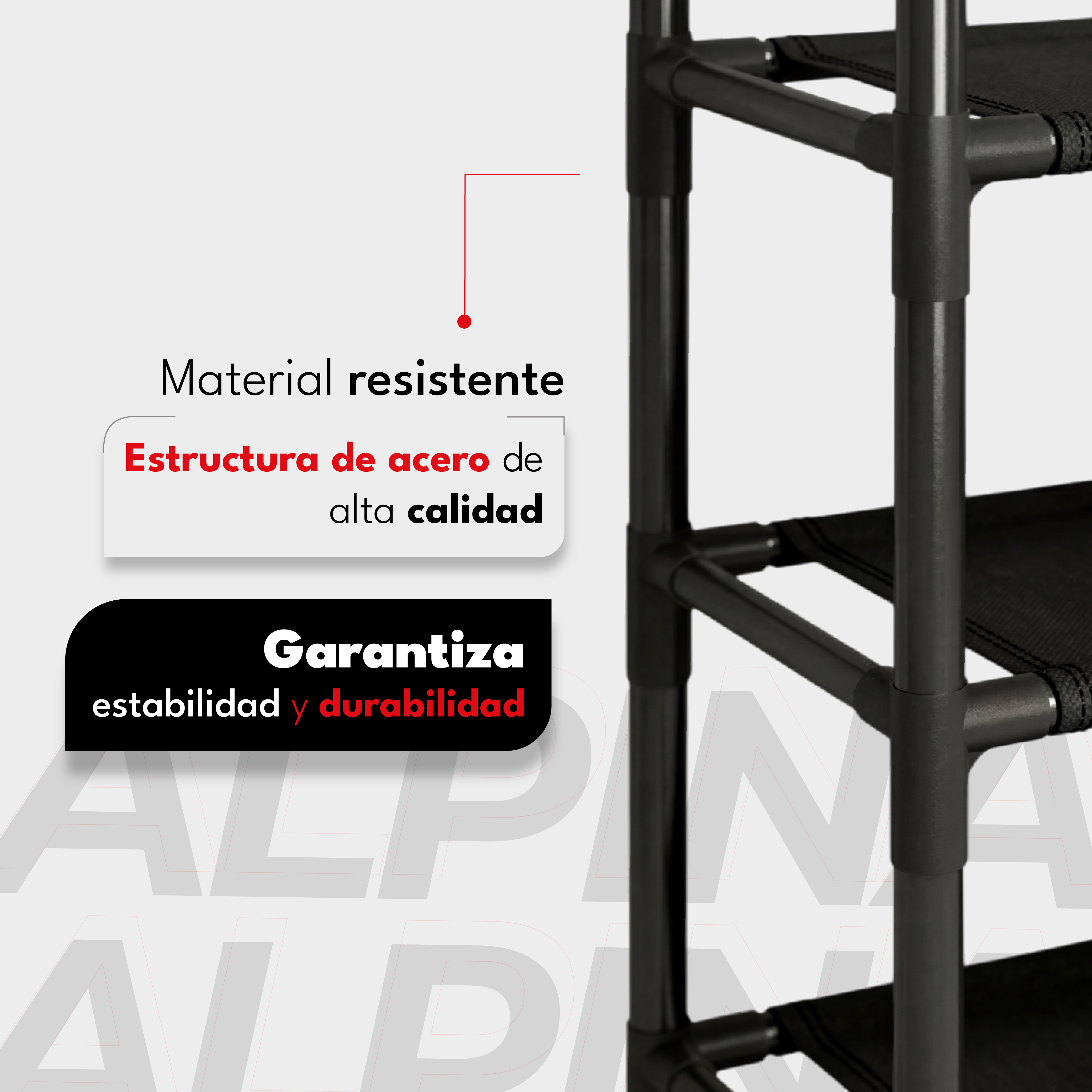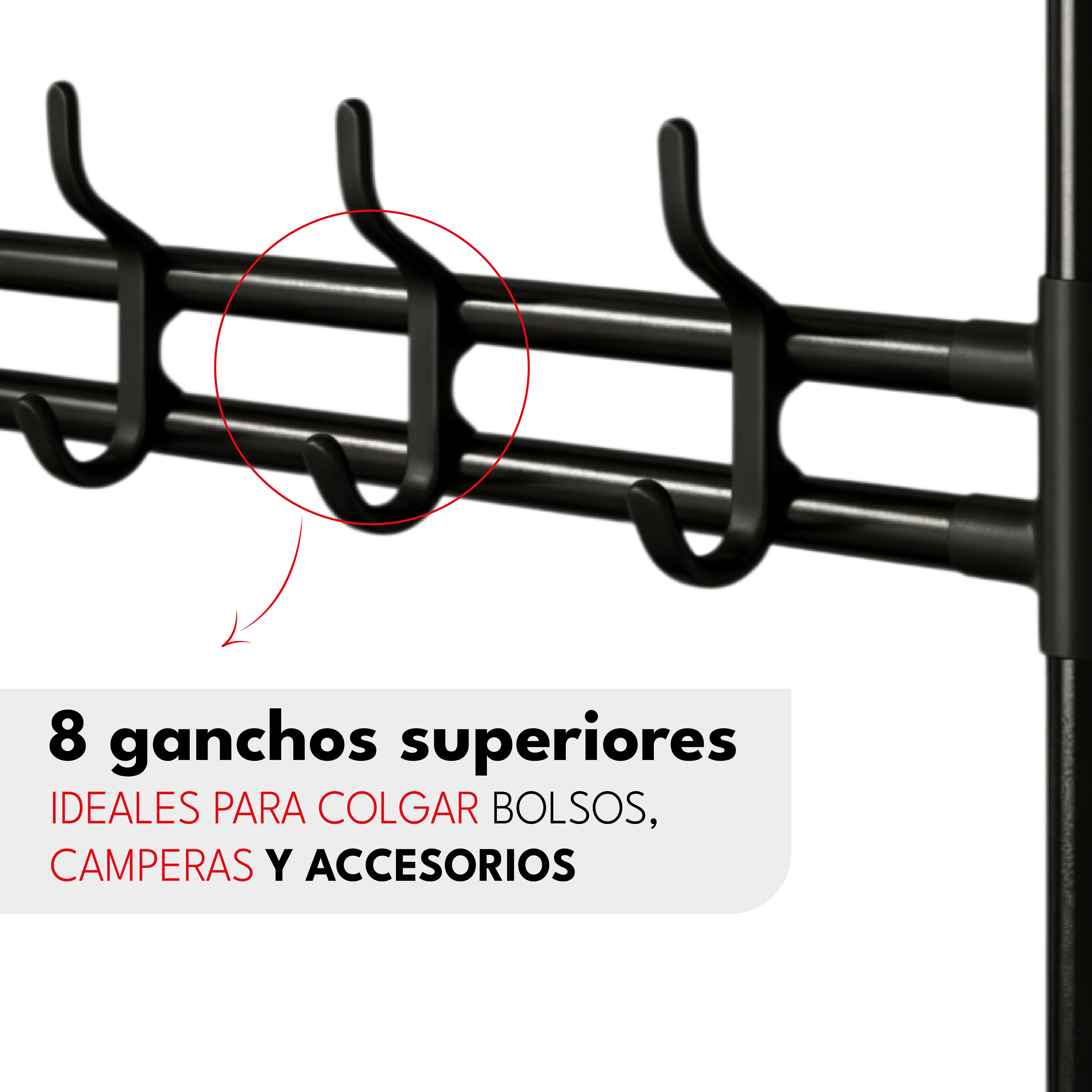 A diferencia de los organizadores convencionales, este modelo está fabricado en acero de alta resistencia, lo que garantiza estabilidad y durabilidad. Incluye 8 ganchos superiores para camperas, mochilas o accesorios, y 4 estantes inferiores diseñados para zapatos, cajas o canastos. Todo en una sola pieza funcional y moderna.
