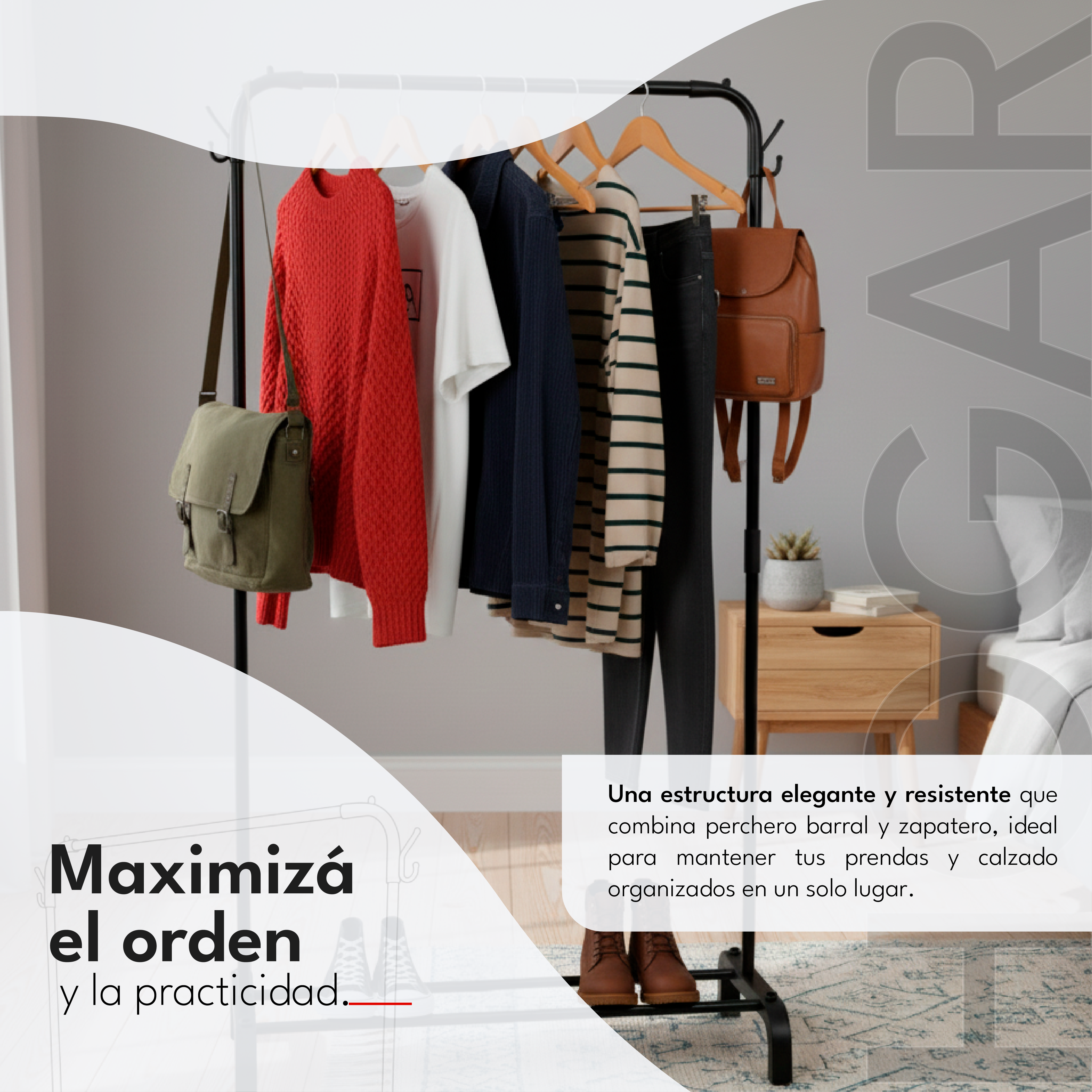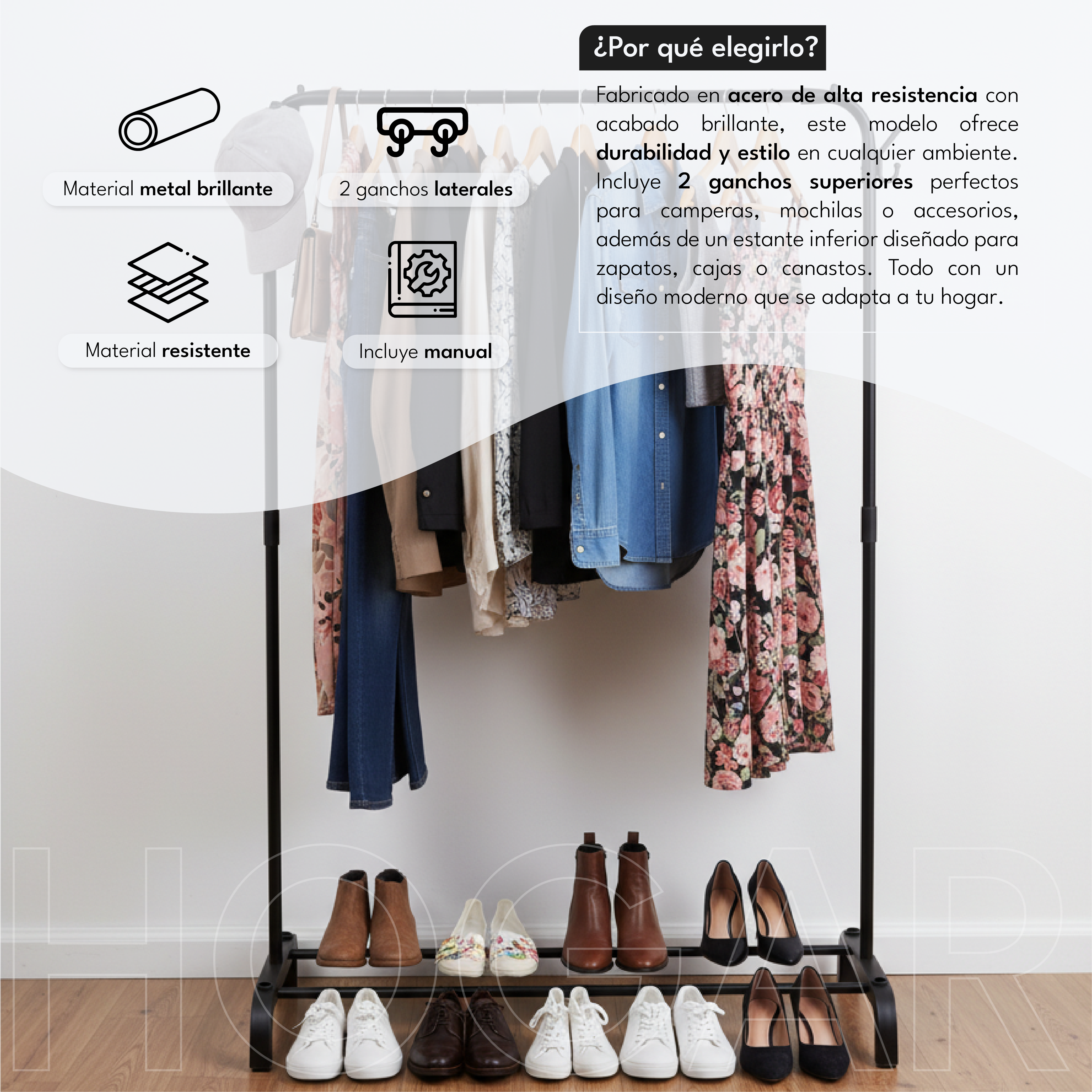Fabricado en acero de alta resistencia con acabado brillante, este modelo ofrece durabilidad y estilo en cualquier ambiente. Incluye 2 ganchos superiores perfectos para camperas, mochilas o accesorios, además de un estante inferior diseñado para zapatos, cajas o canastos. Todo con un diseño moderno que se adapta a tu hogar.