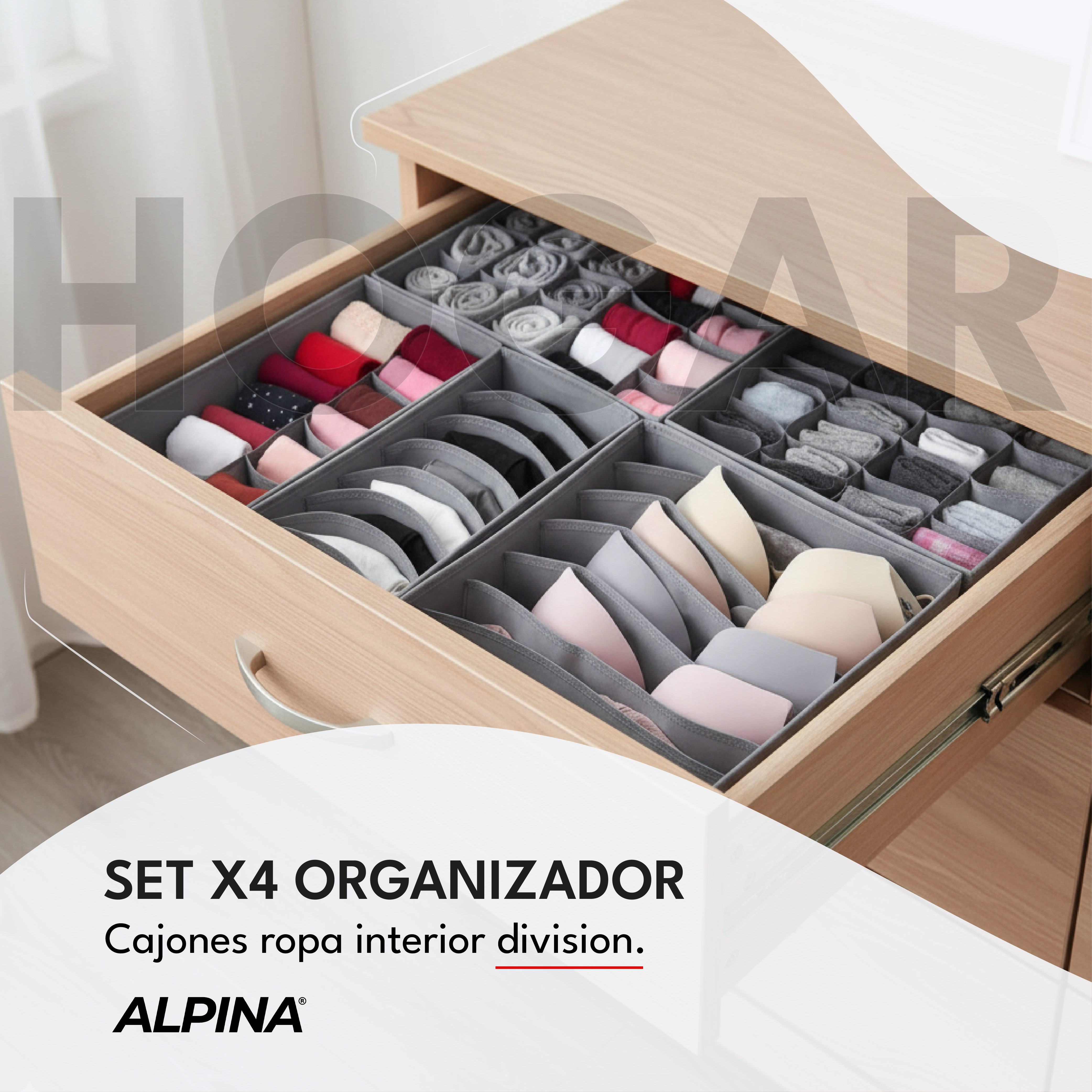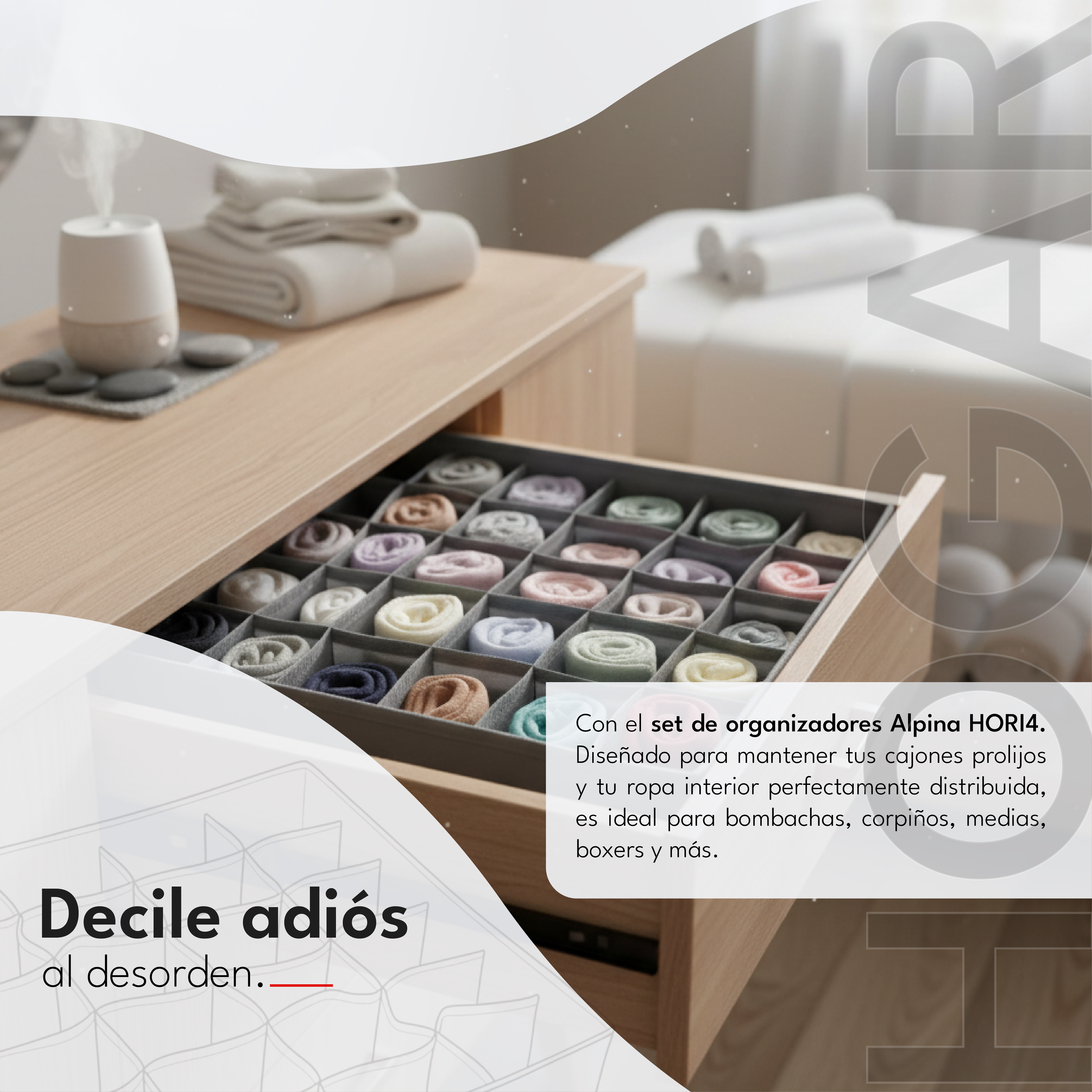 Decile adiós al desorden con el set de organizadores Alpina HORI4. Diseñado para mantener tus cajones prolijos y tu ropa interior perfectamente distribuida, es ideal para bombachas, corpiños, medias, boxers y más.