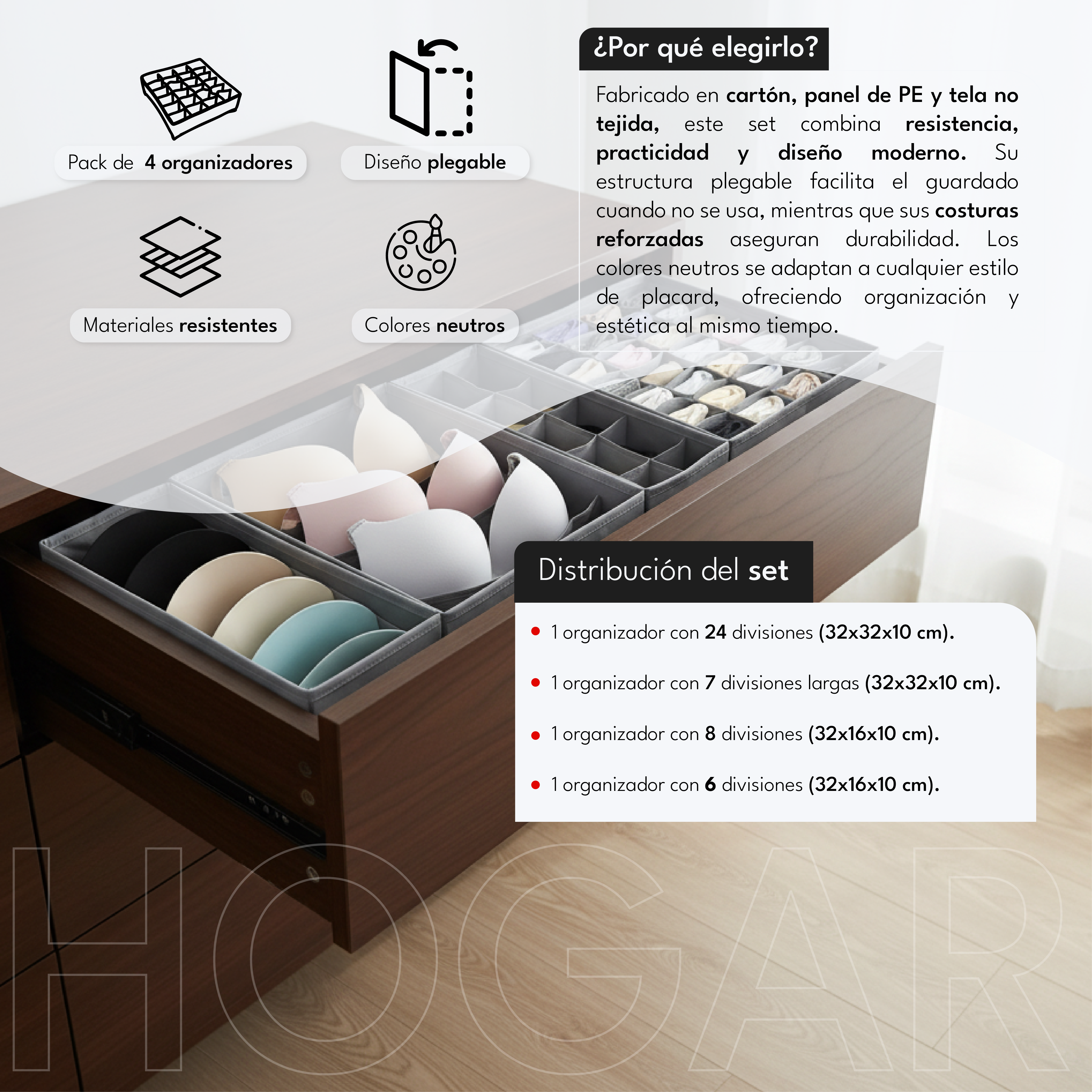 Fabricado en cartón, panel de PE y tela no tejida, este set combina resistencia, practicidad y diseño moderno. Su estructura plegable facilita el guardado cuando no se usa, mientras que sus costuras reforzadas aseguran durabilidad. Los colores neutros se adaptan a cualquier estilo de placard, ofreciendo organización y estética al mismo tiempo.
